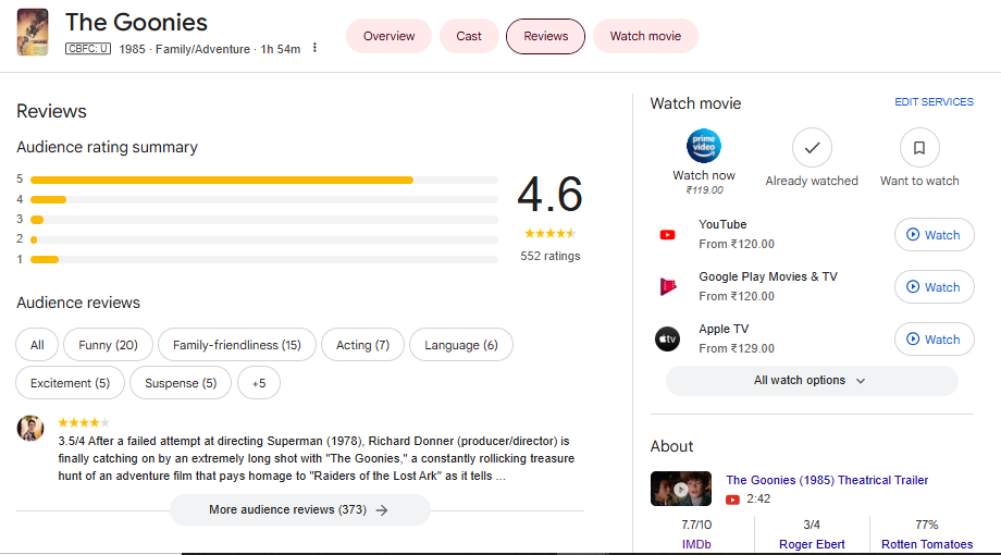 The movie, with a 7.7 rating out of 10 on IMDb, was liked by 88% of Google users. Below is the image that shows audience reviews about the movie.